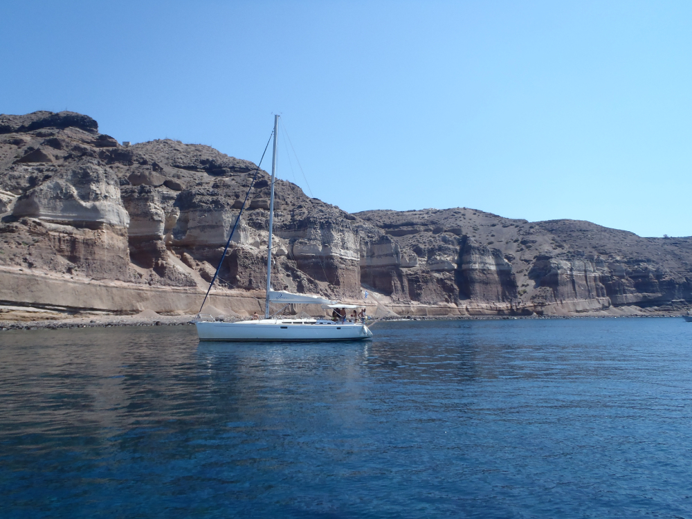 Embark on a spectacular day at sea as we set sail from Vlychada Marina and begin our journey across the captivating coastline of Santorini. We cruise past the striking Red Beach, known for its dramatic crimson cliffs,