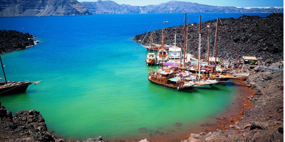 We begin our adventure from the serene Vlychada port, cruising along the island’s dramatic coastline.